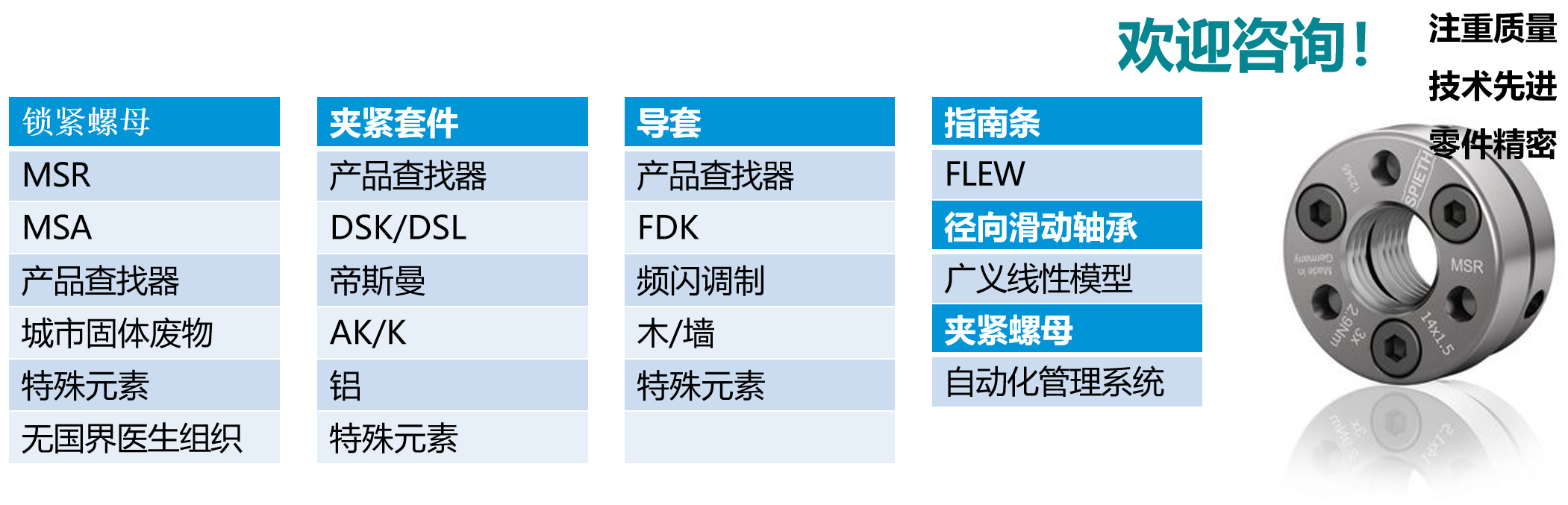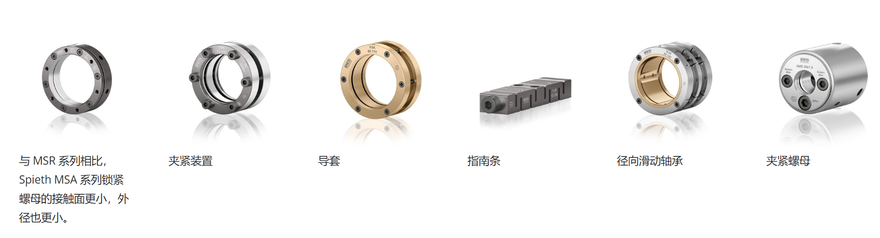 絕對的質(zhì)量和微米精度——這是他們在驅(qū)動(dòng)和引導(dǎo)部件的機(jī)械連接、軸承和鎖定解決方案方面的承諾。Spieth鎖緊螺母、夾緊套件、導(dǎo)向襯套、導(dǎo)向槽、徑向滑動(dòng)軸承和夾緊螺母在安全性、性能和經(jīng)濟(jì)效益方面為用戶提供了明顯的優(yōu)勢。