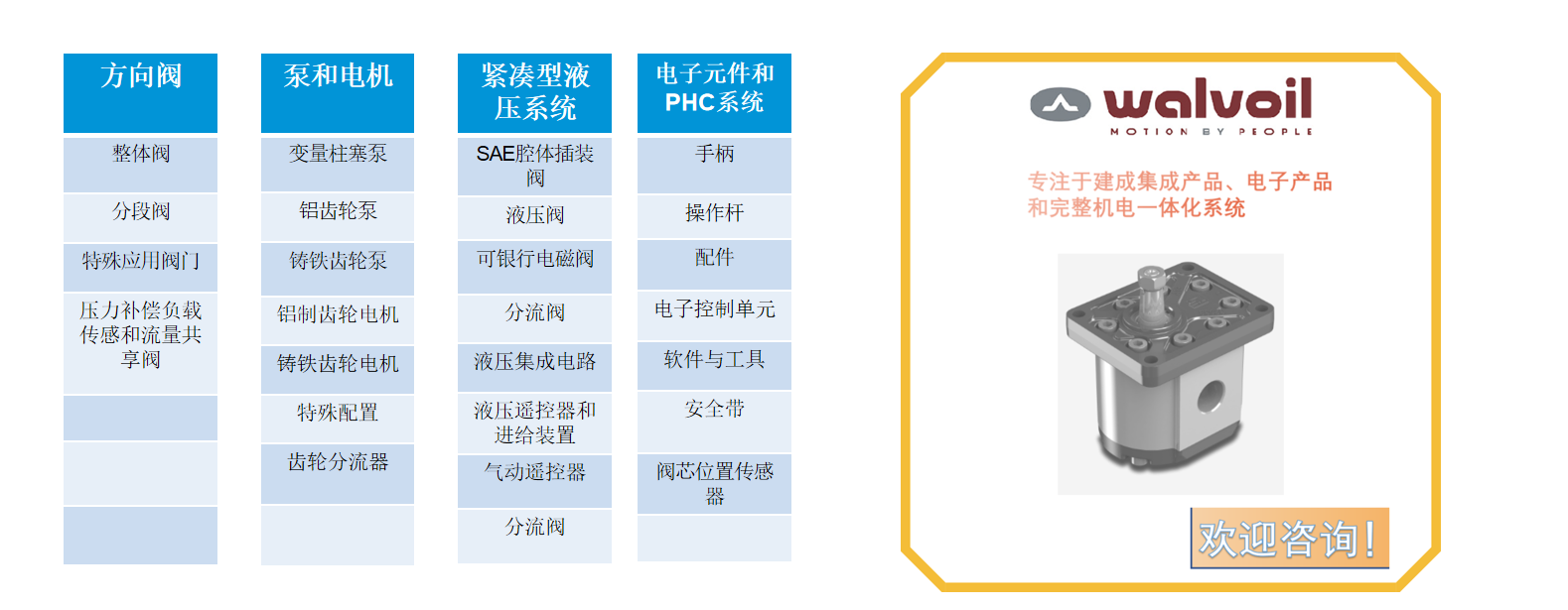 Walvoil方向閥包括整體閥、分段閥、特殊應用閥門、 壓力預補償負載傳感和流量共享閥。方向閥的主要作用是控制液壓系統中油液的流動方向或調節其流量和壓力。具體來說,方向閥通過改變流道來控制油液的流動方向,以滿足對執行元件的啟動,停止和運動方向的要求。這些閥包括但不限于單向閥、液控單向閥、換向閥等,它們在液壓系統中扮演著至關重要的角色。單向閥:允許油液單向流動,防止反向流動,常用于泵的出口,以防止壓力沖擊影響泵的正常工作或防止系統油液倒流經泵回油箱。液控單向閥:它結合了單向閥和液控功能,可以在外部控制信號的作用下改變油液的流動方向。換向閥:具有兩種以上流動形式和兩個以上油口,通過閥芯在閥體孔內的相對運動來接通或切斷油路,從而改變油流方向。
