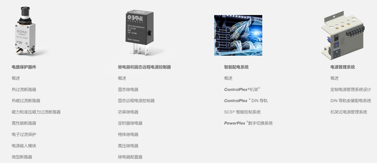 憑借 ControlPlex ®、PowerPlex ®和SCS ®智能控制系統,ETA 為工業應用、船只和車輛提供完整的智能配電和過流保護系統。總線系統提供豐富的集成診斷和監控功能。